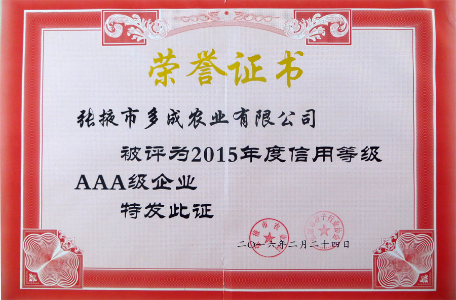 熱烈祝賀張掖市多成農業榮獲2015年度信用等級AAA企業稱號 (2016-02-26)